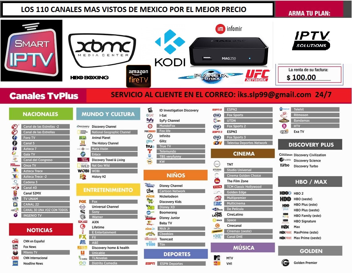 12.06.2015 05:55LISTA DE CANALES DISPONIBLES EN IPTV SOLUTIONS: Ademas el paquete fox+, Mlb Network, NBA TV, Golf Ch, Planeta Futbol y una extensa seleccion de Peliculas en Español.